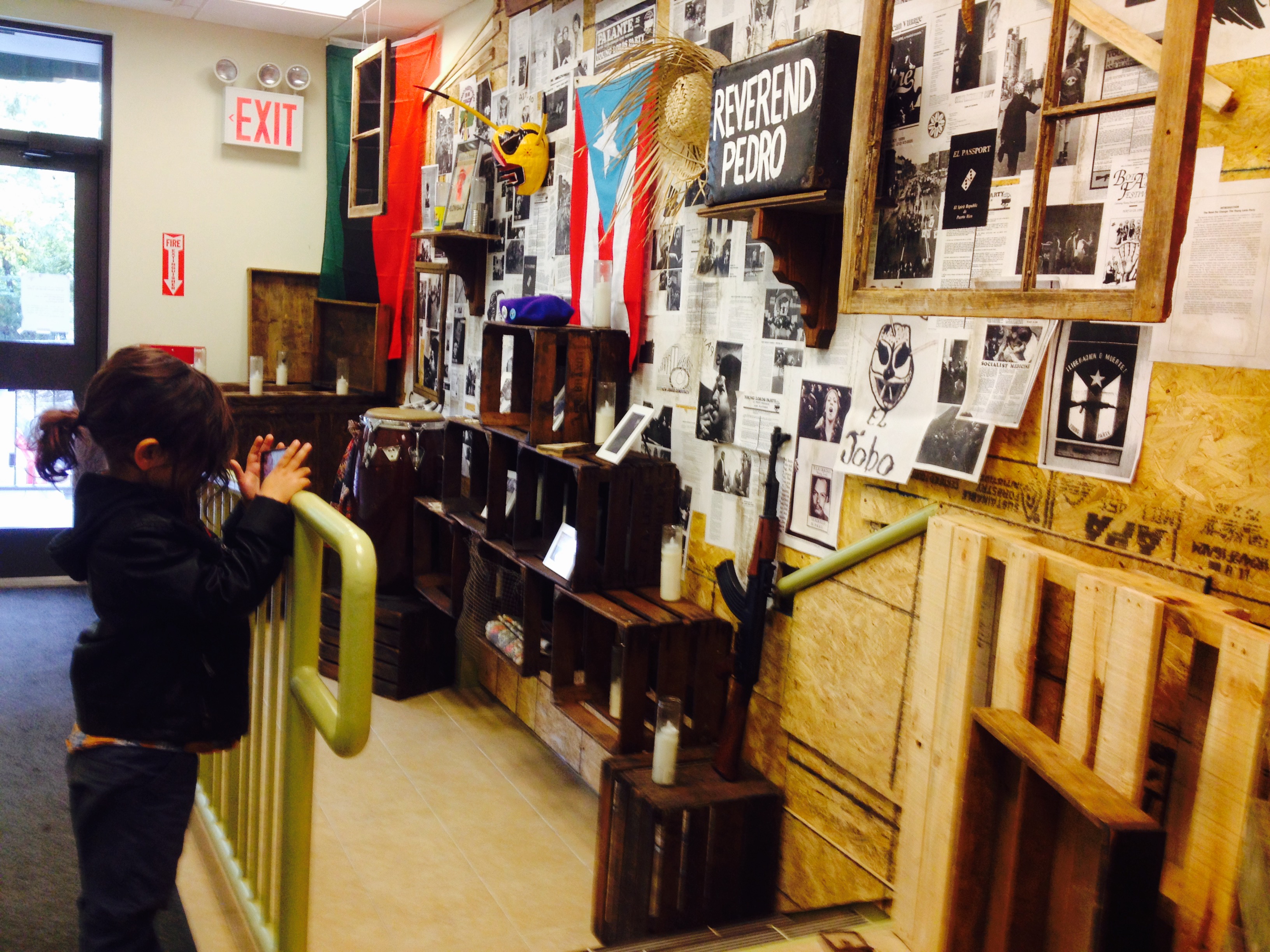 We visited the Young Lords Presente exhibit in the Loisaida Center, in order to explore Puerto Rican activism. I was born and raised in Puerto Rico, and only moved to the United States eleven years ago. After attending an American school in my childhood, I felt that my language, my history, my personality was colonized from an early age, before I even knew what was happening. After a long process of decolonization, (interesting enough, a process undertaken while away from my country, (The imperialist doesn’t tell you of its contempt for you while it is colonizing you, only when you immigrate and assimilate)) I can now appreciate my culture, albeit even to this date, through a lens, thus never really a part of it, always from the outside, displaced. But an activist I am, engaged in fighting systems of oppression, and in fostering empathy and building community and raising a child that will take that fight further. And it seemed fitting to go to the Young Lords Presente exhibit and show my son how other people like him have also undertaken this fight.
